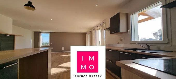 La porte d'entrée s'ouvre sur un espace d'accueil avec vestiaire. Puis une porte à galandage permet d'accéder à l'espace de jour de 60m² baigné de lumière (2 fenêtres et 2 baies vitrées) :